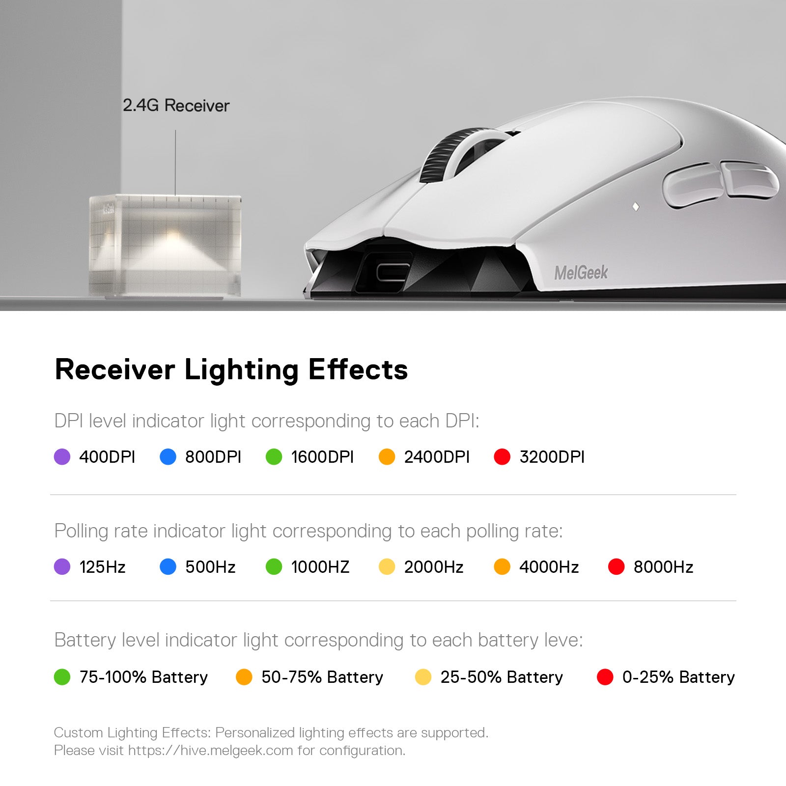 • Multi‑Status Illumination-Distinct lighting effects correspond to DPI, polling rate, battery level, and custom lighting modes.