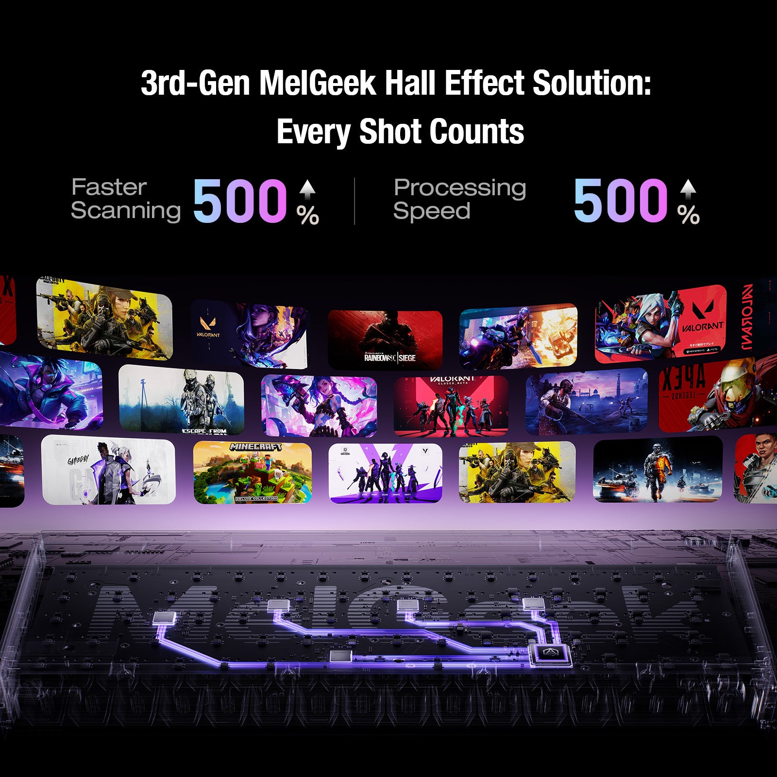 Gracias a su arquitectura distribuida de múltiples microcontroladores, el sistema de interruptores magnéticos de MelGeek ofrece una respuesta un 150 % más rápida y una latencia de 0,125 ms. El procesamiento inteligente de zonas y el escaneo dinámico garantizan una precisión instantánea y una estabilidad sólida como una roca: cada pulsación se registra a la velocidad del pensamiento.