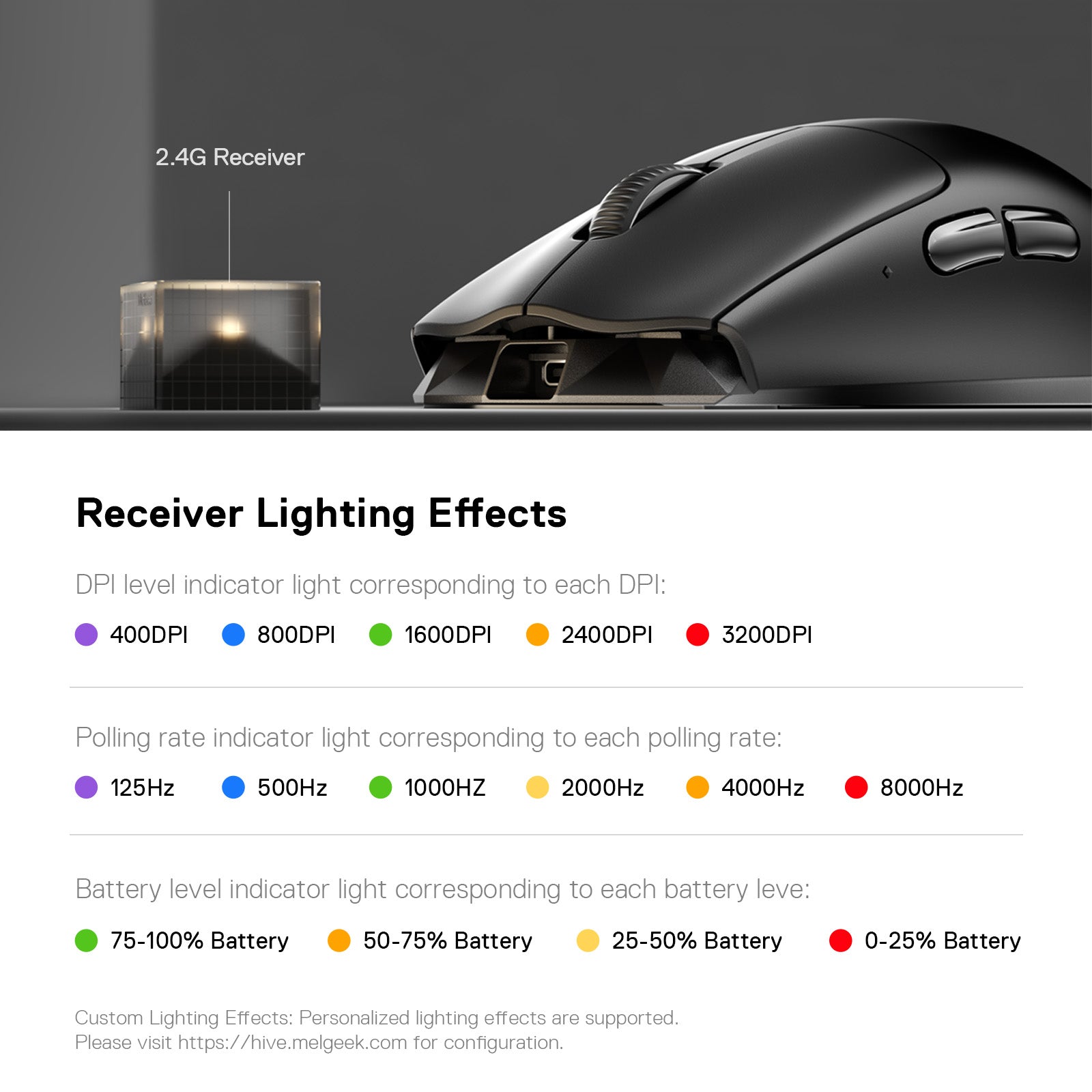 • Multi‑Status Illumination-Distinct lighting effects correspond to DPI, polling rate, battery level, and custom lighting modes.